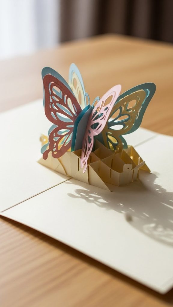 Pop-up paper butterflies are designed to spring forward when a card or book is opened. These butterflies create a sense of surprise and movement, making them especially popular for greeting cards.